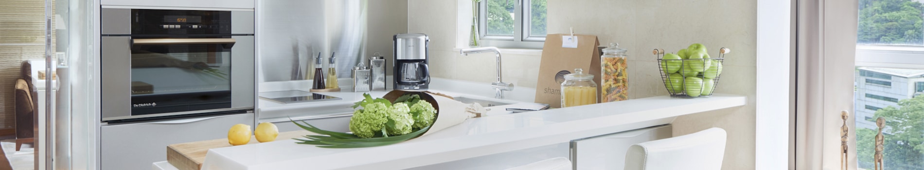 One-per-floor serviced apartments, work space, living room and dining area, kitchenette